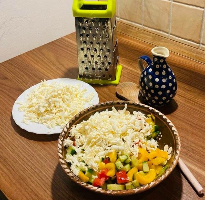 Jetzt den Feta über den Salat reiben. Da er meistens sehr salzig ist braucht man kein zusätzliches Salz.